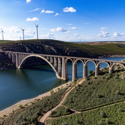 El trayecto nos conduce hacia uno de los grandes hitos de la ingeniería ferroviaria española: el Viaducto de Martín Gil. Esta imponente obra de hormigón desafía el abismo sobre el embalse de Ricobayo y el río Esla, ofreciendo una de las estampas más espectaculares del ferrocarril en España.
