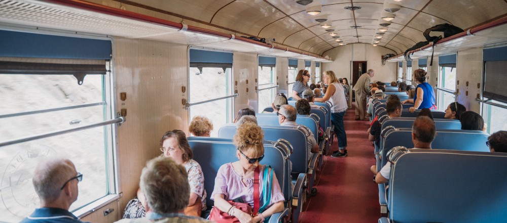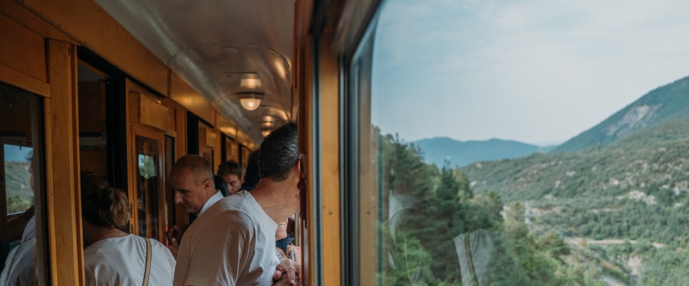 Cada detalle del tren ha sido diseñado para recrear, en un trayecto paralelo al Camino de Santiago, desde Sabiñánigo a Canfranc, la atmósfera de los años cuarenta. Disfruta desde sus acabados clásicos hasta sus amplios ventanales que permiten disfrutar de vistas inolvidables.