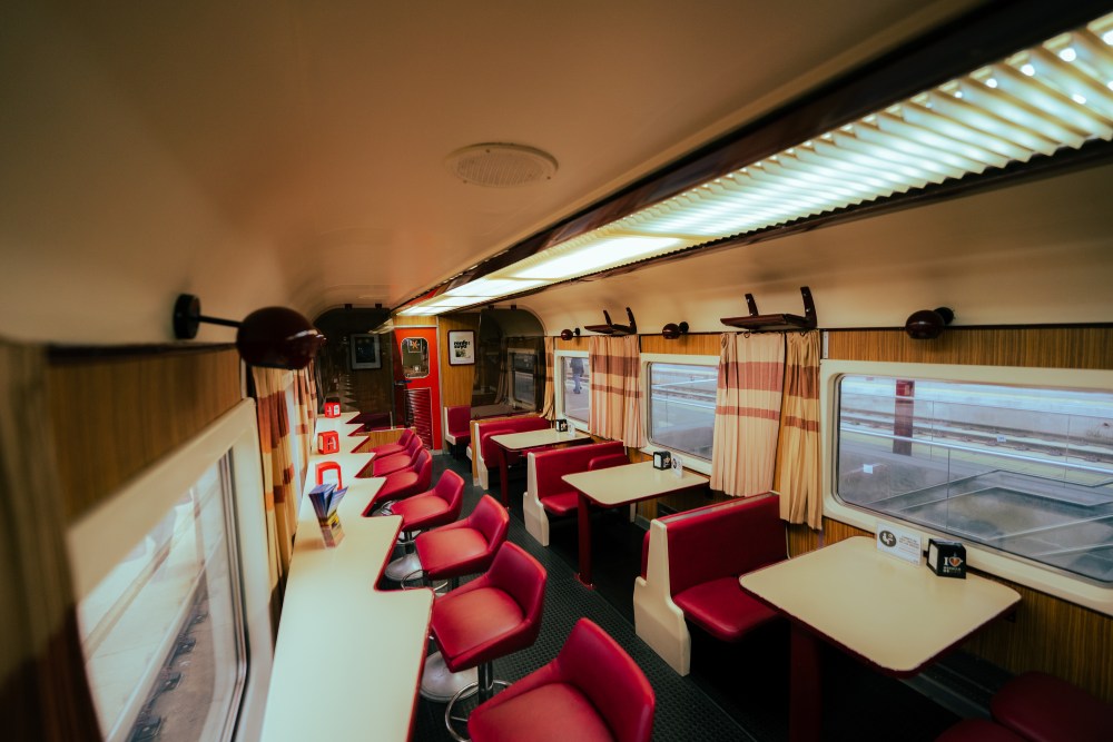 Disfruta de bebidas y aperitivos en la cafetería del Tren de los 80, equipada con todo lo necesario para complementar tu experiencia mientras recorres paisajes únicos.